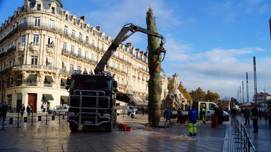 Installation du sapin de Noël à coté d' Aglaé, Euphrosine et Thalie, les Trois Graces qui surmonte la fontaine de la Place de la Comédie. Cette sculpture a été réalisée par Etienne d'Antoine en 1776.