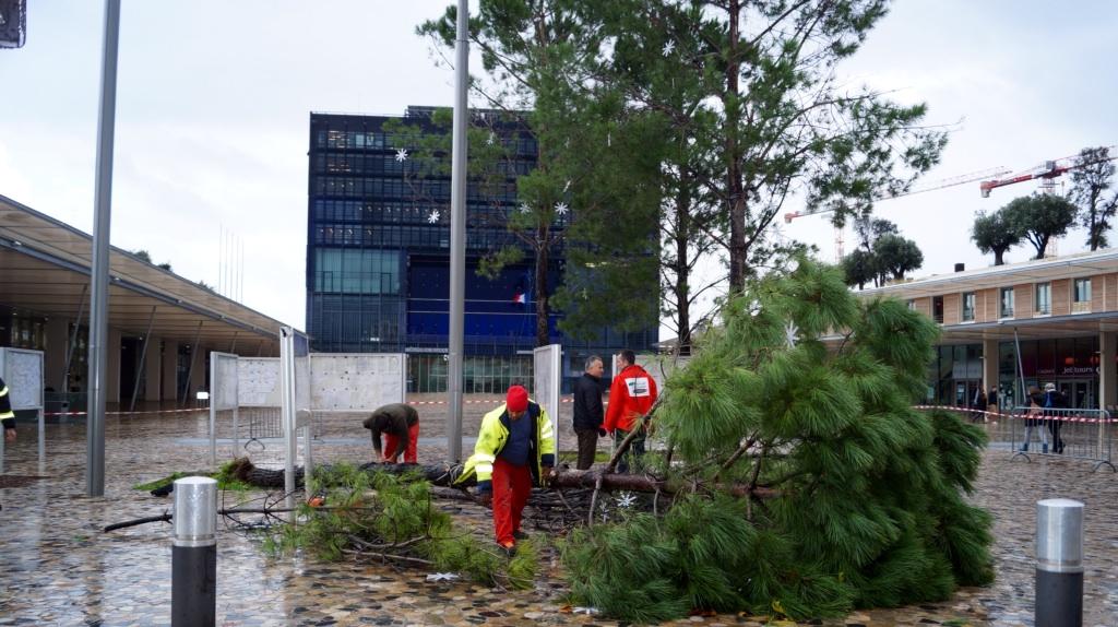 Un pin arraché par le vent devant la mairie de Montpellier . Ce vendredi vers midi, une rafale de vent tourbillonnant particulièrement violente a coupé net un pin du parvis minéral Georges-Frêche en face de la mairie.